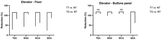 Reduction in colony formation units expressed as a percentage between non-treated (NT) and treated conditions (TT and TG) for various aspects of elevator elements, such as the floor area and button panel. The data are the average values from two separate experiments conducted in triplicate (mean ± standard deviation), and the results are expressed as percentages: ns: not significant.