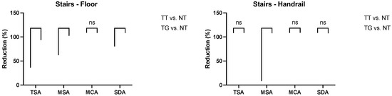 Reduction in colony formation units expressed as a percentage between non-treated (NT) and treated conditions (TT and TG) for various aspects of stair elements, such as the floor area and the handrails. The data are the average of two separate experiments conducted in triplicate (mean ± standard deviation), and the results are expressed as percentages; ns: not significant.