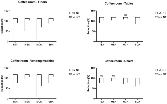 Reduction in colony formation units expressed as a percentage between non-treated (NT) and treated conditions (TT and TG) for various aspects of the coffee room, including the floor area, vending machine, and tables. The data are the average of two separate experiments conducted in triplicate (mean ± standard deviation), and the results are expressed as percentages: ns: not significant.
