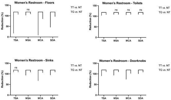 Reduction in colony formation units expressed as a percentage between non-treated (NT) and treated conditions (TT and TG) for various aspects of the women’s restroom, such as the floor area, toilet surfaces, sink surfaces, and doorknobs. The data are the average of two separate experiments conducted in triplicate (mean ± standard deviation), and the results are expressed as percentages: ns: not significant.
