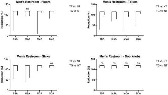 Reduction in colony formation units expressed as a percentage between non-treated (NT) and treated conditions (TT and TG) for various aspects of the men’s restroom, such as the floor area, toilet surfaces, sink surfaces, and doorknobs. The data are the average of two separate experiments conducted in triplicate (mean ± standard deviation), and the results are expressed as percentages: ns: not significant.