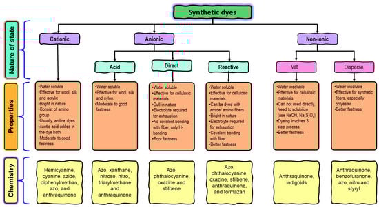 Dyes are a class of organic compounds that possess the ability to impart color to a diverse range of substrates [,]. Frequently, these compounds are recognized for their ionization properties and notable water solubility, leading to their facile dissemination into both the surroundings and human physiology []. The intricate aromatic structures of these substances pose a challenge for biodegradation and render them inert, thereby rendering their elimination a more arduous and laborious task. In contrast to metal ions, dyes can be classified in various ways. The most prevalent classification method is based on the charge exhibited upon dissolution, which leads to the formation of three distinct groups: anionic (inclusive of reactive, acid, and direct dyes), cationic (encompassing all basic dyes), and non-ionic (comprising disperse dyes). Dyes can be categorized into acid and base based on the various associated groups that dictate the hue of the color. Acid dyes are anionic chemicals containing acid moieties in their molecular structure such as sulfonic SO32− and carboxylic -COO¯, while base dyes are cationic ones presenting quaternary amine groups -NH4+ []. Another systematic method of classification is the color index, which is related to the chemical structure of the dye substance; however, due to the complexity of nomenclature from the chemical structure, the classification based on color application is the most preferable []. With respect to chemical structure, a variety of groups such as azo, diazo, anthraquinone, nitro, diphenylmethane and triphenylmethane, indigoid and thionindigoid, anthraquinoid, xanthene, phthaleins and metal complex dyes are known (Figure 1). Meanwhile, the mode of application and substrate-based scale classifies them into reactive, acid, base, vat, direct, solvent, disperse, and azoic dyes [,].