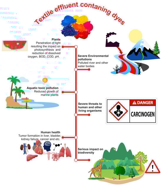 In recent years, there has been a significant focus on the removal of dyes from wastewater owing to their hazardous properties and conspicuousness also now this wastewater also contains the microplastics [,]. The presence of dyes in wastewater can have severe consequences, including the disruption of photosynthesis and oxygen deficiency caused by the obstruction of sunlight. These dyes can accumulate in food chains, leading to aesthetic issues in aquatic and soil environments. Moreover, their carcinogenic and mutagenic properties can result in the formation of tumors and mutations. The toxic amines and biologically non-biodegradable byproducts present in dyes can also have immunological and dermal effects. Additionally, the presence of dyes can disrupt seed germination and hinder plant growth, as well as cause chromosomal aberrations and various diseases [,]. To mitigate the detrimental impact of dyes and other chemical waste generated by the textile industry on both the environment and human health, it is imperative to extract the contaminated wastewater from the hazardous effluents prior to their release into water bodies. Therefore, the subsequent sections will present a concise review of the impact of health and environmental concerns linked to these effluents. There exists a more profound discussion concerning the significance of employing sustainable methodologies for the removal of effluents using various strategies. The primary objective of this review study is to consolidate and analyze the effects of wastewater containing dyes, as well as their possible implications for human health and the environment. Additionally, the dedicated section delineates a range of ecologically friendly approaches for the management and treatment of wastewater in the textile sector, together with its respective advantages and disadvantages.
