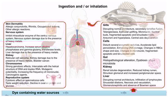 Fish and other aquatic animals, which are widely acknowledged as a substantial protein source for human consumption, has the potential to ingest dyes through their diet [,]. The wastewater generated by the textile industry has significant coloration, a fluctuating pH, and contains various salts, alkalis, and acids, which contribute to elevated levels of biological oxygen demand (BOD), chemical oxygen demand (COD), total organic carbon (TOC), and suspended solids (SS) []. In general, the presence of SS hinders the passage of water across the fish’s gills, impeding the exchange of gases and potentially leading to reduced growth or mortality. In addition, prolonged exposure to textile effluents was found to diminish fish feed consumption, thereby leading to a decrease in the growth rate []. The genotoxic effects of reactive azo dyes on adult fish involve the promotion of erythrocytic micronuclei development, which is dependent on both the dose and duration of exposure. In fingerlings, the creation of gill micronuclei is also influenced by the duration of exposure to these colors. Fish are prone to a variety of illnesses due to the detrimental impact of hypoxia on their immune system and physiological responses (see Figure 4). Consequently, the presence of contaminated fish exerts a substantial influence on human well-being. Textile dyes are extremely deadly and include aromatic chemicals that have the potential to cause cancer [,,]. They have been connected to a range of disorders in both humans and animals, including dermatitis and issues with the central nervous system [,,]; Figure 4 lists these ailments in humans. Typically, there are two paths, which include textile dye ingestion or inhalation can irritate the skin and eyes [,,], particularly if it occurs in dusty conditions []. Persons who work with reactive dyes run the risk of experiencing allergic responses, including occupational asthma, allergic conjunctivitis, and contact dermatitis. Textile dye genotoxicity is the biggest possible long-term risk to human health [,,,,]. Certain dyes have the potential to cause mutagenic reactions; one such dye is Disperse Red 1 [].
