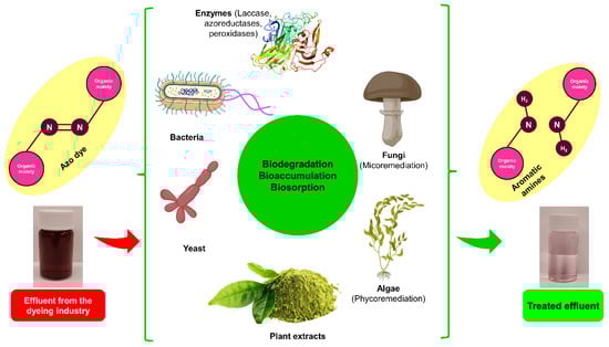 Although it is true that certain microorganisms can degrade auxochromes and chromophores found in dyes, hence facilitating the removal of organic materials from textile waste, it is worth noting that some of these microorganisms are also capable of mineralizing colors into carbon dioxide and water (see Figure 6). The rationality of color removal in biological processes, even conventional ones, has not been empirically shown Figure 6. The rate of removal is contingent upon several factors, including the concentration of O2, the ratio of organic load to microorganism load and dye load, and the temperature range [,]. Table S1 presents a comprehensive compilation of the merits and demerits associated with diverse biological techniques employed in the elimination of dyes.