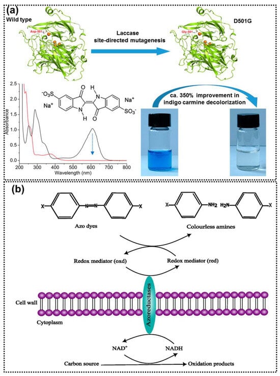 Site-directed mutagenesis of laccase from B. amyloliquefaciens for improving indigo carmine decolorization (a) (reproduced from [] as distributed by Creative Commons Attribution License). Azoreductase on azo dyes with the formation of colorless amines (b) (reprinted from []).