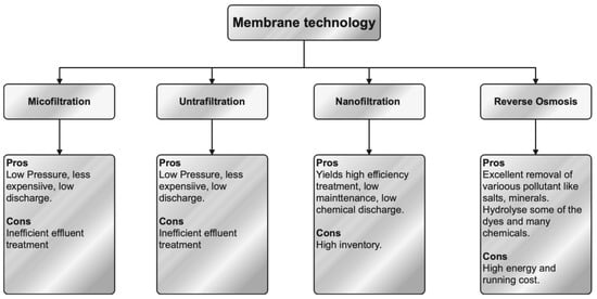 Membrane separation technology is commonly employed for the treatment of effluents generated by textile dyeing processes. During the filtering process, the micropores included in the membrane filter effectively separate the organic compounds from the effluent by utilizing selective membrane permeability. The classification of this phenomenon encompasses four distinct categories, namely ultrafiltration (UF), nanofiltration (NF), reverse osmosis (RO), and forward osmosis. The process of separation may be effectively achieved by the utilization of UF, which has shown great potential as a technique. The elimination of dissolved compounds occurs at a reduced transmembrane pressure through the utilization of UF. The utilization of polyelectrolyte complexes, in conjunction with cellulose acetate and inert polymers, is applied in the production of UF membranes that exhibit the capacity to efficiently regulate flow. The normal range for pore size is between 0.001 and 0.02 μm. NF is an intermediate technique between reverse osmosis and ultrafiltration, characterized by the use of membranes with nanometer-scale pores (0.5–10 nm) and operating at pressures of 5–40 bar. NF is a very sophisticated membrane-based technique that demonstrates remarkable efficacy in the removal of heavy metals [,,]. The membranes of NF possess a thin outer layer that is typically non-porous, operating at the nanoscale, and exhibiting a high level of permeability []. One of the primary benefits of NF is its reduced energy consumption, which leads to a higher efficiency in the removal of contaminants []. Presently, several textile industries employ RO as a means of treating their effluent. RO is categorized as a membrane-based technique. The RO membranes effectively capture suspended particles through their small pores, hence mitigating fouling. The pre-treatment procedure plays a crucial role in the regulation of turbidity levels and fouling tendencies []. Figure 8 illustrates the classification of membrane filtering techniques together with their respective advantages and disadvantages.