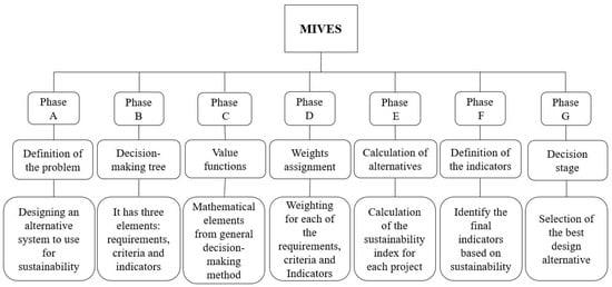 The MIVES approach intends to reduce subjectivity when making decisions and integrating environmental, economic and social factors simultaneously []. MIVES has certain characteristics that are not present in other sustainability assessment methods. As one example, it not only focuses on cost, but also on combining other requirements, such as social and environmental impacts, while also considering most construction lifecycle stages []. MIVES enables comparisons to be made according to relevant criteria and sub-criteria []. Figure 1 presents the different MIVES phases demonstrating how the model works overall.