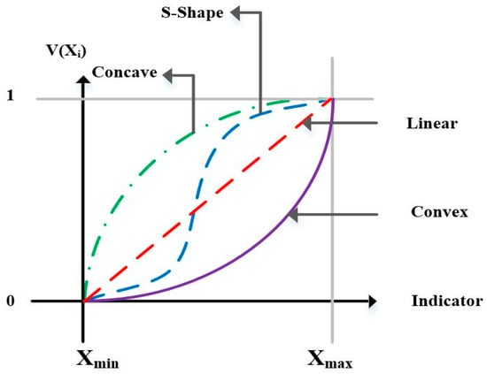 For each indicator, value functions for quantifying satisfaction/value (between 0 and 1) were defined. This dimensionless value scale is important to normalize the sum of the values for each indicator []. Figure 2 shows the various shapes of the value functions.