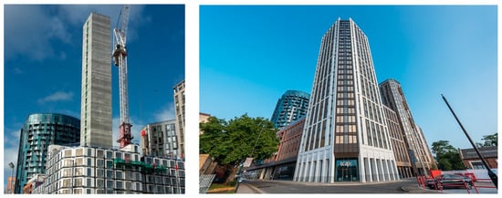 Ten Degrees Croydon is located at 101 George Street, Croydon, London, CR0 1EH, UK. It comprises twin residential tower buildings, 44 and 38 stories high, comprising 546 homes. This development includes the world’s tallest residential modular building. Tide Construction and Vision Modular Systems created the 135 m high scheme by manufacturing the buildings in a controlled factory environment. The developer and manufacturer completed project construction in just over two years. This is half the time it would have taken to erect the buildings using traditional construction methods []. Figure 3 shows the Ten Degrees Croydon buildings.