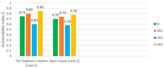 The results obtained from the sustainability assessment of Ten Degrees Croydon (case study 1) and Apex House (case study 2) are given in this section. This evaluation is illustrated in Table 1. The indicator values and function and weight allocations are as follows. The indicators are quantified for both cases based on the formulas given in Section 2.3. The indicator measurements are presented in Table 5. After quantifying the indicators, the results are presented in Table 9. Excluding the SI value of each case, the satisfaction value of requirements (VR), value of criteria (VC) and value of indicators (VI) were obtained and are shown in Table 9. These values form the factors for the decision-making process.
