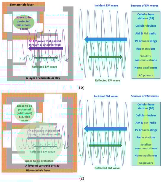 Furthermore, the entire facility can be made of biomaterials or only rooms that are of greater importance (sleeping area, children’s room, etc.), or as a combination of both approaches. Buildings made of straw and mud have existed in various parts of the world for thousands of years, and lately, they are starting to be rebuilt as a response to existing materials as ecological structures [21,22]. However, their influence on EM radiation has been neglected.
