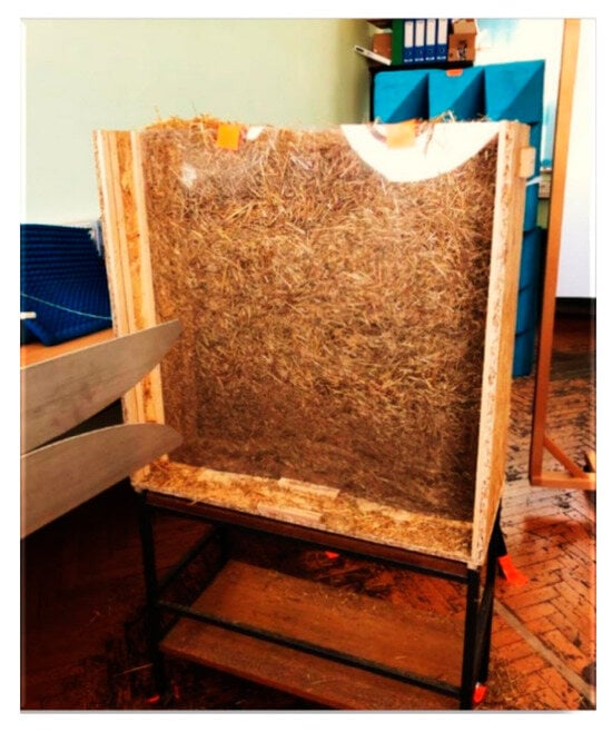 The biological materials for which the absorption was measured refer to dried and chopped soybean straw, wheat straw, and large clovers (Figure 4). They were used as a bio-substrate of uniform mass through which the EM radiation of different frequencies was passed under controlled conditions. In addition to the dry substrate, moist absorbers were also used, which were made so that a certain amount of water could be added to the dry straw. Industrially produced composites form part of the measuring set-up while the measurement straws alternated inside the constructed housing. The constructed case was made as a wooden box with a movable PVC partition that could be placed at three distances from the last wooden panel of the box (at a distance of 100, 200, and 300 mm). In this way, three “plates” of biomaterials with a thickness of 100, 200, and 300 mm were made (Figure 5). These measurements are carried out by placing the PVC partition at a position 100 mm away from the back panel of the wooden box and filling it with 3.8 kg of the substrate, the measurement of which is carried out; and then the PVC partition is placed at a distance of 200 mm (and filled with 7.6 kg of the substrate) and the measurement is carried out; and finally, the partition is placed at a distance of 300 mm from the back panel of the wooden box (and filled with 11.4 kg of the substrate) and the measurement is carried out. In this way, three “panels” made of substrate thicknesses of 100, 200, and 300 mm and a density of 67.56 kg/m3 were formed.