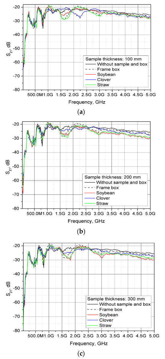Measured S21 parameters of dry straw thickness samples: (a) 100 mm; (b) 200 mm, and (c) 300 mm (relative moisture < 5%).