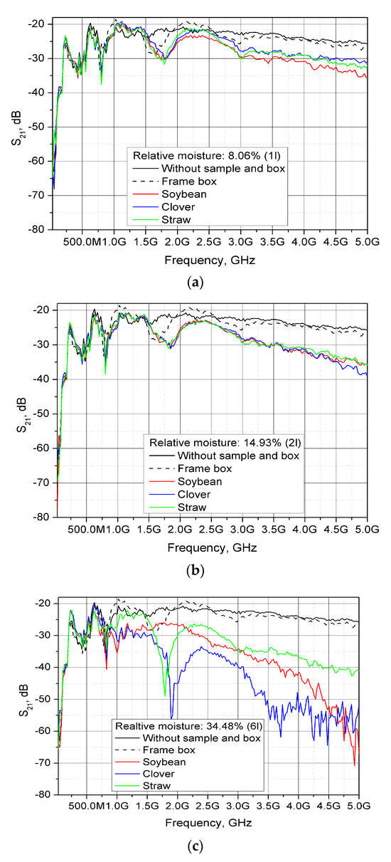 Due to the increase in the moisture of the sample, the transmission parameter of the EM wave through the sample dropped to the value of −35.55 dB (the difference was according to the box frame of −9.1 dB) for a soybean straw sample with a moisture content of 8.06% at a frequency of 5.00 GHz; −39.23 dB (the difference was according to the box frame of −12.78 dB) for a clover straw sample with moisture content of 14.93% at a frequency of 5.00 GHz; and −70.80 dB (the difference was according to a box frame of −43.80 dB) for a soybean straw sample with a moisture content of 34.48% at the frequency of 4.93 GHz (Table 2). The thickness of all wet measured samples was 300 mm. For the lowest amount of moisture in the samples (8.06%), the lowest values of the transmission parameters in the entire measurement range (above 700 MHz) were shown by the soybean straw sample; for the middle level of moisture (14.93%) there was no significant difference in the values of the transmission parameters between samples. For the highest amount of moisture (34.48%), the lowest values of the transmission parameters are shown in the clover straw sample.