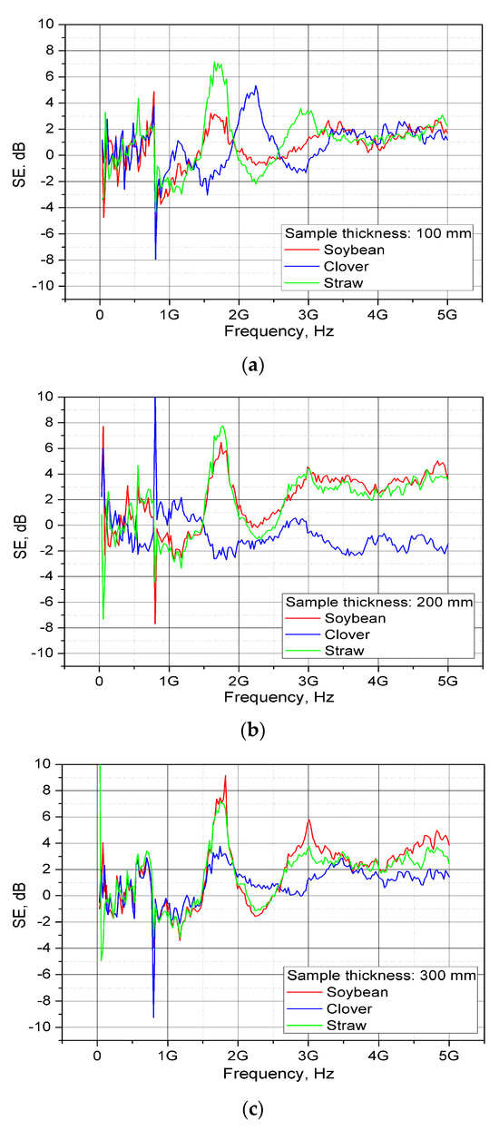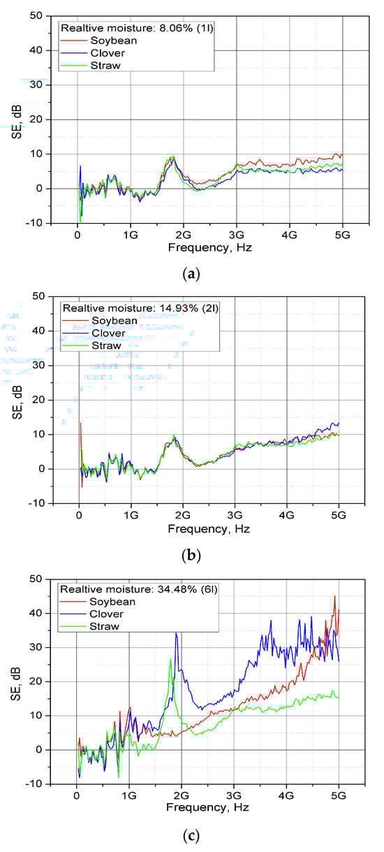 The highest SE of 45 dB at a frequency of 4.9 GHz was reached for the soybean straw sample with the highest humidity (34.48%). However, in the entire frequency range (Figure 10c), the clover straw showed the highest SE values (Table 4).