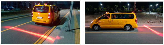On-road experimental setup. Projected text on left side: “Temporarily Stop” (translated from Korean). Projected text on right side: “No Overtaking” (translated from Korean).