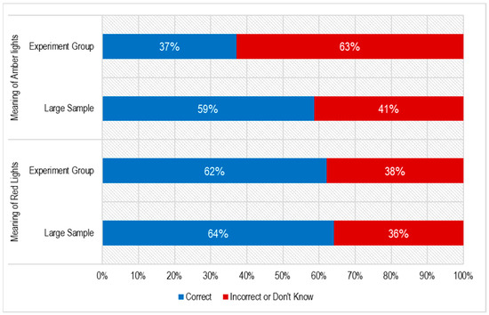Firstly, respondents’ understanding of average awareness of the existing school bus lighting systems was tested. The results were from both the survey (237 respondents) and experimental group (29 participants). The respondents were asked the same questions about what the flashing amber and red lights on school buses are supposed to indicate, and Figure 5 (below) shows the results. Participants in the experimental group showed a lower understanding of the meaning of the amber lights compared to the survey. However, for the meaning of the red rights, both the larger sample and experimental groups had a similar understanding. These results confirm our hypothesis that a significant (approximately 40%) portion of drivers in Korea do not have a good understanding of what the existing lighting systems mean.
