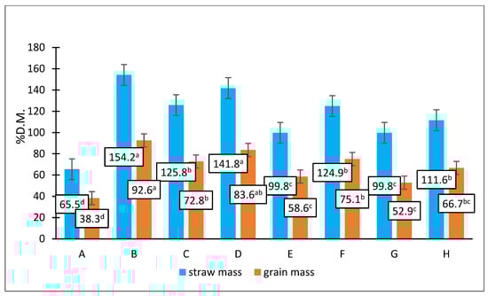 Dry mass of straw and grain from the plant. A, B, C, D, E, F, G, H—variant fertilizer, (n = 4). Different letters in the columns indicate significant differences (p < 0.05) according to the analysis of variance (ANOVA). The standard error is marked on the columns.