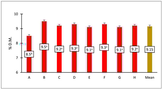 The grain protein content notably increased after mineral or organic fertilization in comparison to the control. The results across individual fertilization variants (B–H) consistently exceeded 9% dry matter (D.M.). Contrastingly, the protein content in the control seeds stood at only 8.5% D.M. (Figure 3).