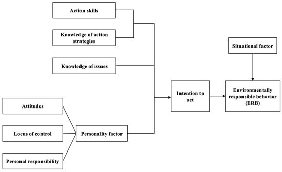 Environmentally responsible behavior (ERB) is a concept in environmental psychology and is defined as any action taken by individuals or groups to address environmental issues and protect the environment []. Hines et al. [] developed the ERB model through a comprehensive meta-analysis of 128 pro-environmental behavioral research studies. This model identifies the cognitive, affective, and social situational variables associated with ERB and describes their interrelationships in affecting and predicting ERB, as represented in Figure 1.