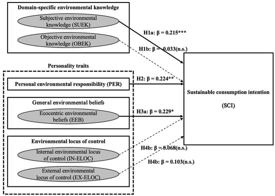 Additionally, EEBs (β = 0.229; t = 2.482; p = 0.013 < 0.05) exhibited a positive and significant effect on SCI. This relationship suggested that consumers who genuinely consider nature concerns over material interests and focused on enhancing human life quality were more likely to have pro-environmental intentions, aligning with previous research [,]. Consumers holding eco-centric environmental beliefs acknowledge the adverse effects of human activity on the environment, endorse natural laws, stress resource conservation, and prioritize safeguarding environmental balance for societal well-being.