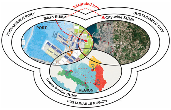 This paper presents an approach and methodology that form the foundation for creating a territorial SUMP customized to the distinct requirements and situations of a port and the urban regions connected to it. The objective of such a territorial or micro-SUMP for the port area is to establish sustainable transportation guidelines that facilitate a harmonious connection between the port area and its surrounding region. This integration should take into consideration the principles of sustainable development for the city (including aspects such as spatial planning, traffic management, economic development, and social programs) as well as the port area. In line with this vision, the SUMP serves as a tool for aligning urban policies with the “sustainable city” concept and port policies with the “sustainable port” concept (Figure 2). Furthermore, the development of the micro-SUMP must also be in line with regional coordination and collaboration, as the transportation system under the purview of the micro-SUMP is intricately connected to the broader urban system and extends into regional and cross-border areas.