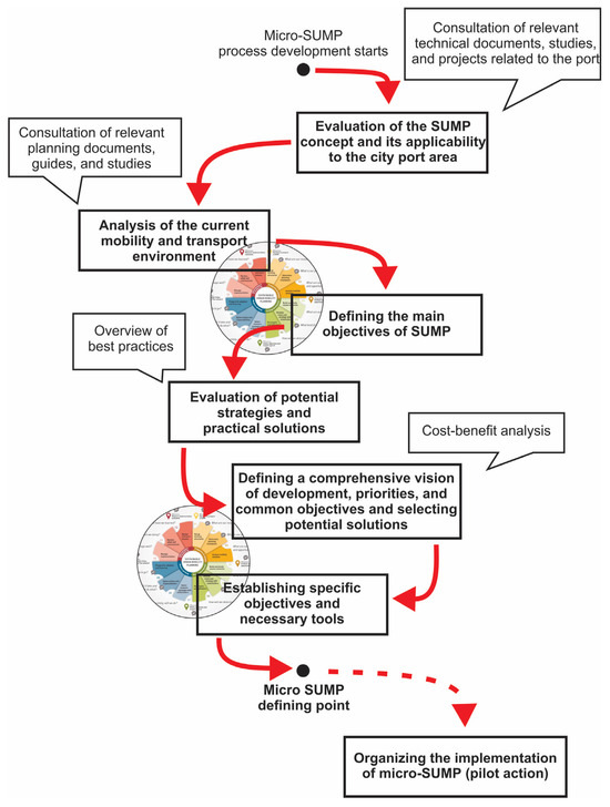The proposed methodology is based on several steps involved in crafting a comprehensive territorial SUMP, with a particular emphasis on an integrated view of the port area with its hinterland, respecting both the sustainable development of the urban city area and the port area. The proposed approach involves a two-stage mobility planning strategy: the first stage encompasses a city-wide SUMP, with its definition falling under the responsibility of the municipality, and the second entails a micro-SUMP designed specifically for the port area and formulated as a result of the collaboration between the municipality and port authorities. Therefore, this micro-SUMP is seamlessly integrated with the broader city-wide SUMP. The primary contribution of the developed approach is founded on the principle of subsidiarity, which involves the creation of a fundamental SUMP, within which the formation of a micro-SUMP dedicated to specific areas is encouraged. These micro-SUMPs enable local-level actions tailored to address area-specific issues. In the case of a port area, this approach ensures that mobility and sustainability planning can be customized to the unique challenges and opportunities that pertain to that specific region. The utility of the developed approach was assessed through an appropriate case study for the formulation of sustainable solutions related to mobility in a certain port area.