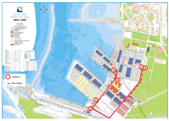 The proposed route encompasses six stations, beginning and ending at the port’s entrance gate, with four intermediate stations strategically positioned to cater to the frequent transport demands of workers during both working shifts. Implementing this solution would decrease the number of cars in the port area, positively impacting space utilization and leading to a reduction in noise and pollution levels within the port vicinity. Considering the expected peak usage of the service at the beginning and end of shifts, there would be a notable time window of 3 to 4 h during each shift where the bus could serve other purposes, such as transporting tourists between the Port of Bar and the Old City of Bar (Solution 3). This efficient utilization of capacity could yield significant financial and environmental benefits.
