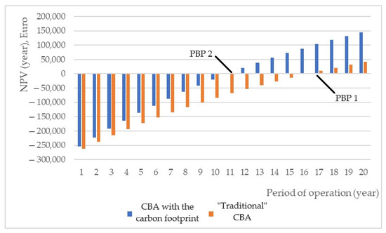 To assess the feasibility of the solution (pilot project), the following indicators were utilized: the net present value (NPV) of the project, calculated using a discount rate of 5% [57], and the pay-back period (PBP). The determination of the NPV and PBP is based on the financial cash flow, and the financial calculations are elaborated in Appendix A. Table 3 and Figure 7 compare the results of the CBA conducted in two ways: the “traditional” approach (without considering the external costs) and the approach that accounts for the overall carbon footprint. The table shows that the pay-back period for the “traditional” CBA is 17 years, while for the CBA, based on the carbon footprint, it is 11 years.