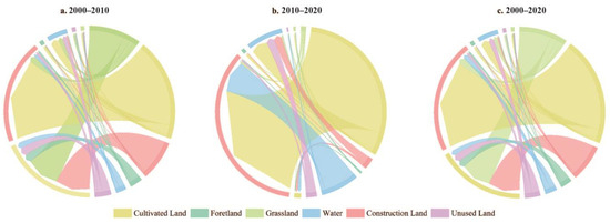 As shown in Figure 4, from 2000 to 2010, the largest area transferred was construction land, mainly from cultivated land (975.5 × 103 hm2) and water (76.5 × 103 hm2), followed by cultivated land, which was mainly transferred from construction land (404.7 × 103 hm2) and grassland (397.8 × 103 hm2). The largest areas transferred out were cultivated land (1115.4 × 103 hm2) and grassland (569.3 × 103 hm2), which were mainly converted to construction land (975.7 × 103 hm2) and water (96.9 × 103 hm2). However, the area of construction land transferred to cultivated land (404.7 × 103 hm2) was much smaller than the area of cultivated land transferred to construction land (975.7 × 103 hm2). This indicates that in the rapid urbanization stage, human activities change the way that arable land and grassland are used, as well as advance the process of urbanization and industrialization to obtain economic benefits to meet human well-being needs.