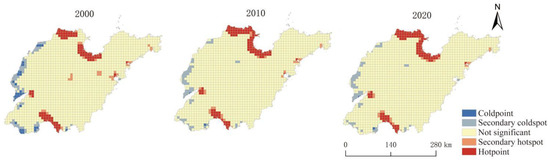 Spatial distribution pattern of cold and hot spots of ESV in Shandong Province from 2000 to 2020.