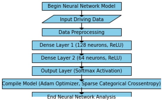 The neural network model is structured as a multi-layer architecture, where each layer is responsible for extracting and learning different levels of patterns from the input driving data. The initial layer processes basic features, which are then passed on to subsequent layers for more complex pattern recognition. The training process involves adjusting the model weights based on historical driving data, enhancing its ability to differentiate between safe and risky driving behaviours. This model’s performance is later validated using a separate set of data to determine its predictive accuracy. The following high-level description demonstrated in Figure 1 below presents the methodology structure.