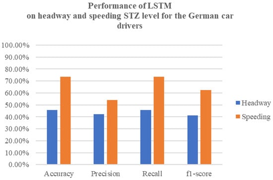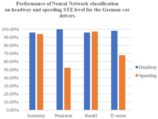 Following the application of these models, a confusion matrix was generated for the independent variables of interest, namely headway and speeding, as presented in Table 2 and the performance of neural network classification on headway and speeding STZ level for the German car drivers is presented in Figure 3. This matrix provides valuable insights into the classification’s performance and forms the basis for further analysis and discussion in this study.