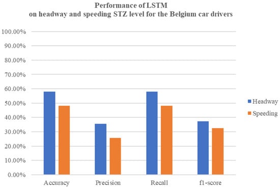These findings strongly suggest the models’ effectiveness in classifying instances related to headway and speeding. The speeding model, in particular, exhibited exceptional performance in detecting positive cases. It is noteworthy that both cases showed an absence of false positives (FP = 0), a significant accomplishment indicating a minimal rate of incorrectly identified positive cases. Additionally, a performance of neural network classification on headway and speeding STZ level for the Belgium car drivers is presented in Figure 5.