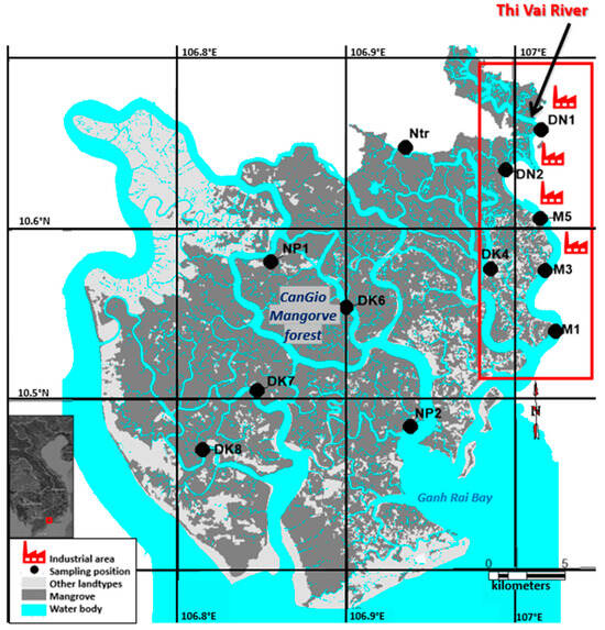 Thi Vai River is located at the boundary between Ho Chi Minh City on the left bank, Dong Nai province on the northeast bank, and Ba Ria Vung Tau province on the southeast bank (Figure 1), from latitude 10°22′ to 10°44′ N and from longitude 106°46′ to 107°01′ E. The mangrove forest mainly occupies the left bank of the river. This forest belongs to the Can Gio Mangrove Forest, one of the most successfully rehabilitated mangrove forests in the world. The mangrove species R. apiculata is the main planted species and covers more than 60% of the forest, among other naturally occurring species. The Thi Vai catchment is subject to asymmetric semidiurnal tidal regimes and a tropical monsoon climate with two distinct seasons, the dry season (from November to April) and the rainy season (from May to October). Industrial zones and international ports have been established on the right bank of the river, operating since the year 2000 resulting from the industrialization process. The severe pollution in this river was caused by uncontrolled wastewater discharges from industrial activities. It was determined that before 2006, over 60% of industrial zones released untreated wastewater directly into the river [], causing heavy pollution of the waters and sediments in this catchment, especially HMs pollution [].