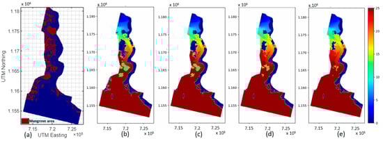 Other assumptions were that (i) there was only one planted mangrove species, R. apiculata, in the forest; (ii) there were no disturbances after the forest was planted (e.g., felling or breaking due to extreme weather); and (iii) all scenarios had the same initial forest conditions in accordance with the recorded reforestation history of this forest. Figure 2 shows the distribution of the mangrove area (Figure 2a) and salinity distribution under sea level rise (Figure 2b–e).