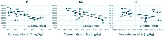 It is shown from the data that tree growth is retarded by high concentrations of Mg, P, and Sr in the leaves in a linear way. These concentrations have a negative correlation with the tree growth rate G (r equals −0.86, −0.62, and −0.65, respectively; Figure 3). It is also noted that the tree growth retardation is strengthened along the increasing salinity gradient. Among those three concentrations, Sr is not an essential element for plants, but plant cells have entry mechanisms for Sr such as plasma membrane transporters for Ca and K []. The mobility and availability of Sr to plant roots from the soil are controlled by external factors such as the chemical composition of the soil (salinity, pH, and temperature). Sr in mangrove tissues has not been studied yet; however, Storey and Leigh, (2004) [] found that in the leaves of citrus, the accumulation of Sr in palisade and spongy mesophyll was accompanied by the loss of K and its accumulation in the bundle sheath. P and Mg are plant macronutrients with major impacts on plant productivity. Nevertheless, there are studies that show that excessive concentrations of these nutrients may inhibit plant growth, especially in saline soil. Cerda et al. (1977) [] in their research on sesame found that the increment in P concentrations increased yields only at low salinity levels; at higher salinity, yields decreased progressively as P increased. For Mg, Trolove and Reid (2012) [] found that there was a relationship in the Meyer lemon between leaf Mg concentration and leaf stomatal conductance, and there was also a trend for starch to decrease in leaves from plants grown at Mg concentrations above 0.5 mM.