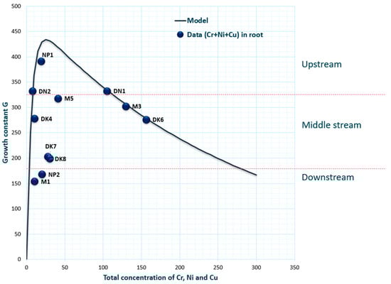 Similar to the linear relationship of Mg, P, and Sr, salinity plays a role in strengthening the inhibition effect of Cr, Cu, and Ni on the tree growth rate, as can be seen in Figure 4. The trees at sites upstream (low salinity) have the highest G values, followed by the sites in the middle and downstream (high salinity), exhibiting the influence of salinity on tree growth. In the quasi-same salinity zone, the effect of contaminant concentrations is shown. For instance, for sites M3 and DK6 located in nearly the same salinity zone, their difference in G values was thus caused by their root concentration (concentration in M3 < DK6; cf. Figure 4). The inhibition of tree growth by this form of nonlinear relationship was discussed before by A. Nguyen, Richter, et al. (2020) []. Mechanisms of plant inhibition by the HMs Cu, Cr, and Ni were also discussed by other authors; for example, Oliveira, (2012) [] discussed that Cr displaces the nutrients from physiological binding sites to enter plant tissues, Ni is extremely toxic to plants when present at excessive levels in the soil or in nutrient solutions to which plants are exposed [], and Cu accumulated in root tissue at concentrations of 200μg/g and higher will inhibit root growth [].