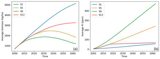 (a) Temporal average biomass (kg ha−1) in scenarios S1, S5, S9, and S13; (b) temporal HMs accumulated in roots () in scenarios S1, S5, S9, and S13.