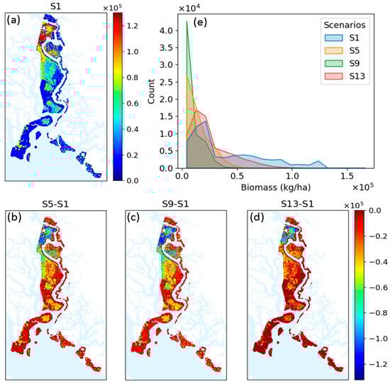 Spatial biomass distribution in the year 2063 (unit: kg ha−1) of (a) S1, (b) S5 compared to S1, (c) S9 compared to S1, and (d) S13 compared to S1. (e) Histogram of biomass distribution of the four scenarios, S1, S5, S9, and S13, in the year 2063.