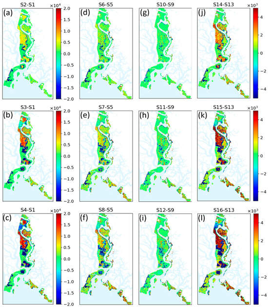 Distribution of Mangrove biomass differences between scenarios in the year 2063 (unit: kg ha−1). Each column represents scenarios with the same pollution conditions while each row shows scenarios with the same climate change conditions compared to no climate change conditions. (a): S2S1 shows the distribution of biomass differences between scenarios S2 and S1, similar explanation for (b–l). Details of scenarios (S1 to S16) are described in Table 1.