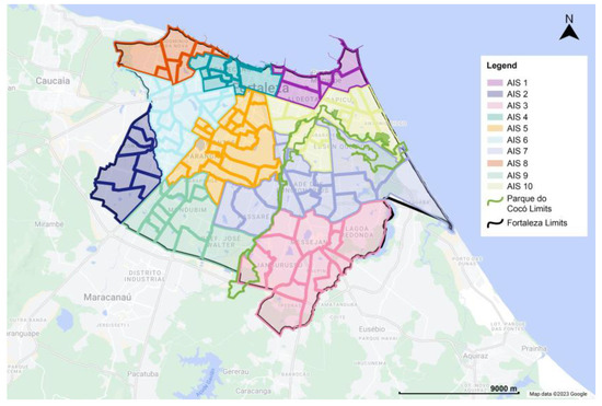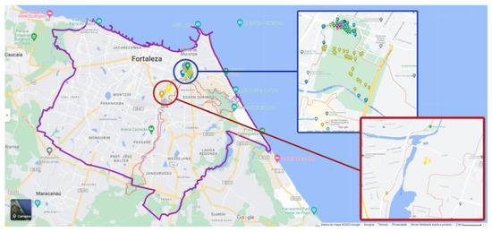 Given the previous information, it is now necessary to provide a brief explanation of the administrative zoning of the city of Fortaleza as well as some primary data. According to data from the latest census conducted in 2010 by the Brazilian Institute of Geography and Statistics [23], Fortaleza ranks fifth among the largest populations in Brazil. It is the capital of its province (state), Ceará, with 2,703,391 inhabitants. Additionally, it has a population density of 7786.44 inhabitants per square kilometer [23].