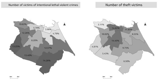 The integrated security areas comprise the public security administrative units of the city, and their division is shown in Figure 2. They are managed through shared governance between the Secretariat of Public Security and Social Defense (SSPDS-CE) units. This administrative division collects and analyzes data related to non-compliance with the law. Using this zoning makes it possible to conduct an analysis of these crimes. Subsequently, the following data collections pertain to theft incidents within the city, and another dataset relates explicitly to instances of lethal violent crimes, with geographic information presented in the form of maps, as seen in Figure 3.
