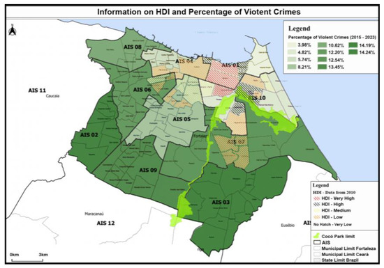 By integrating data on the neighborhood human development index (HDI), the percentage of violent crimes, and the geographical location of Parque do Cocó, it was possible to generate the map in Figure 5.