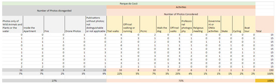 The initial collection comprised the first 150 photos obtained through a search using the keywords “Parque do Cocó” in 2021. For analysis purposes, photos that did not depict the activities of the photographers were disqualified. Similarly, photos that were clearly not taken within the park were non-photographic posts (such as text-only posts or sales advertisements). Those in which the location was indistinguishable were also excluded; the table is shown in Figure 6.