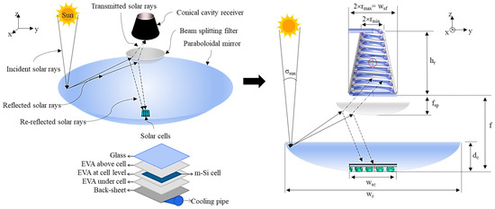 Equation (1) illustrates the splitting process of the reflected rays intercepted by the BSF surface. Solar rays having wavelengths below that of the semiconductor energy bandgap will be transmitted throughout the splitter filter placed at the focal plane of the concentrator. The other sun rays will be reflected back and projected on the plane of the solar cells, positioned at the reference zero-height of the considered vertical datum.