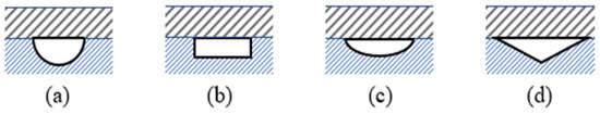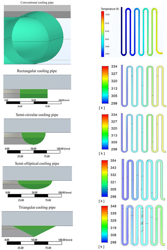 Different cooling pipe cross-sections considered in this study: (a) semicircle, (b) rectangle, (c) semi-ellipse, and (d) triangle.
