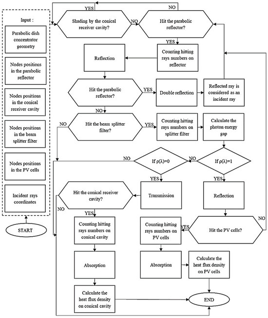 To design the entire system, the geometry modeling equations of the parabolic dish, conical cavity receiver and beam splitting filter were first formulated. The second step was dedicated to numerically investigating the spectral optical behavior of the hybrid system and then the heating load and the useful gain energy that would be removed within the domain of the working fluid for different cooling pipe cross-section shapes.
