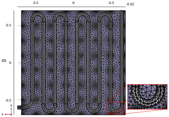 The photovoltaic module and tubing configuration computing domain was modeled in the Design Modeler module of ANSYS. The domain was then discretized using unstructured mesh made up of tetrahedral cells. To properly resolve the fluid boundary layer adjacent to the solid walls, the first height, the rate of increase and number of layers were set, to ensure that the wall y+ < 1. For the solution, the RANS equations representing the mass, momentum and energy conservation equations, and the steady pressure-based model employing the Spalart–Allmaras model were used.